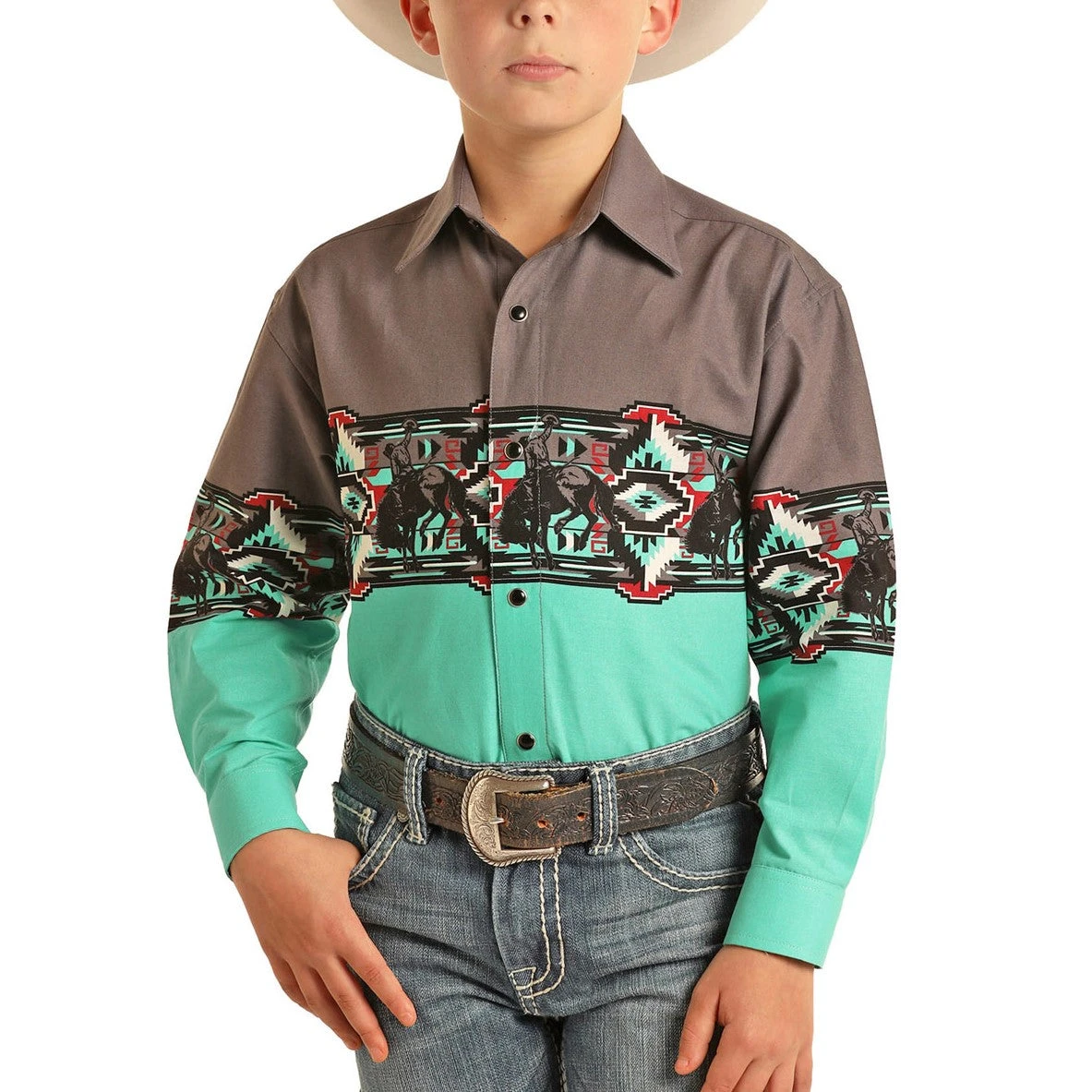 Panhandle Boy’s Turquoise & Grey Western Border Print Shirt C0S2001